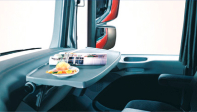 折疊桌(選裝配備)易于展開(kāi)和折疊,讓你能夠在副駕駛員一側(cè)的放松環(huán)境中進(jìn)餐和工作。折疊桌面非常耐磨.在天龍系列駕駛室副座前方能夠收納于后部?jī)?chǔ)物箱或前窗玻璃上方的中間儲(chǔ)物箱之中。折疊桌也作為天龍駕駛室的選裝配備。